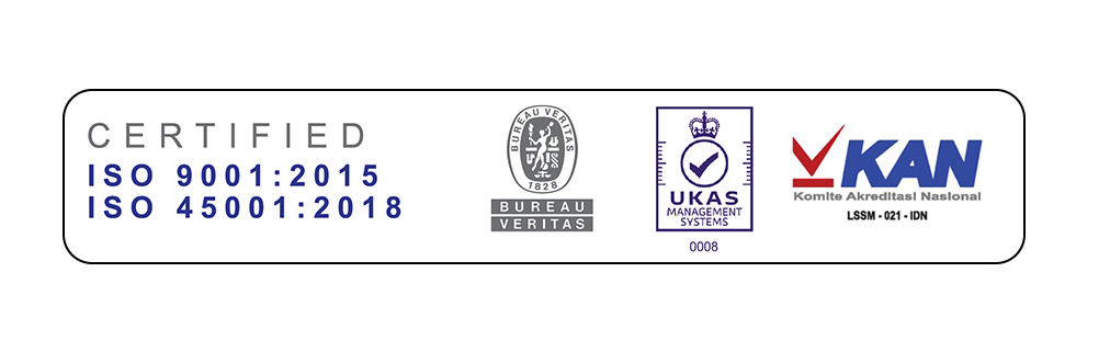 - ISO 45001:2018 dan ISO 9001:2015 Certified by Bureau Veritas. Accredited by UKAS and Komite Akreditasi Nasional (KAN)