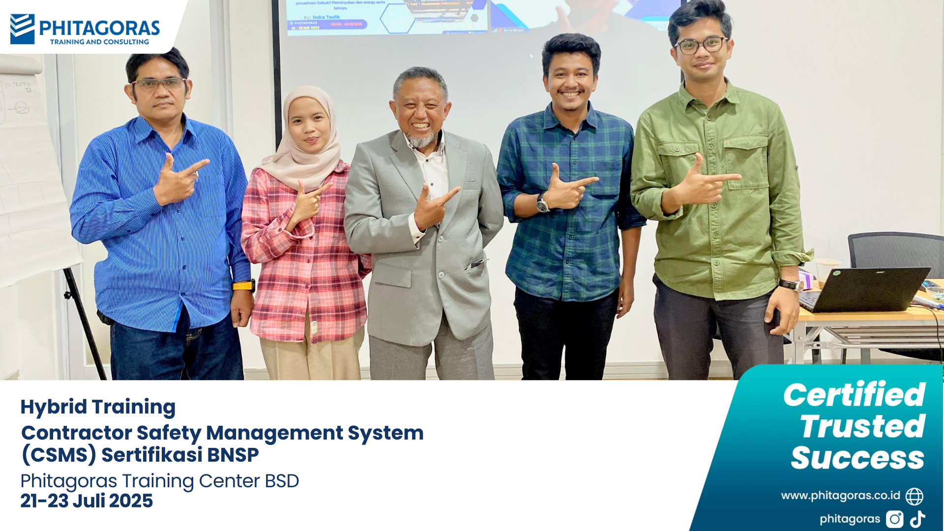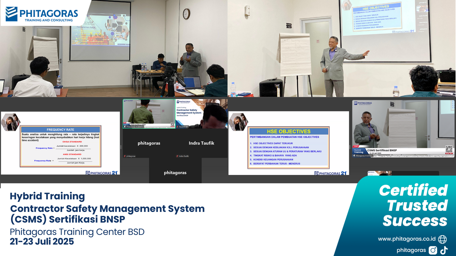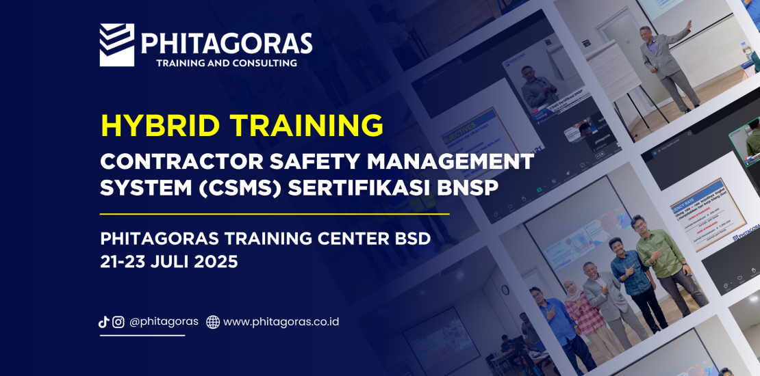 Phitagoras Training & Consulting kembali sukses menyelenggarakan Hybrid Training Contractor Safety Management System (CSMS) Sertifikasi BNSP pada tanggal 21 hingga 23 Juli 2025 bertempat di Phitagoras Training Center BSD. Kegiatan ini dilaksanakan dengan metode hybrid, yaitu kombinasi tatap muka langsung dan online virtual meeting, sehingga memudahkan peserta dari berbagai daerah untuk mengikuti pelatihan.