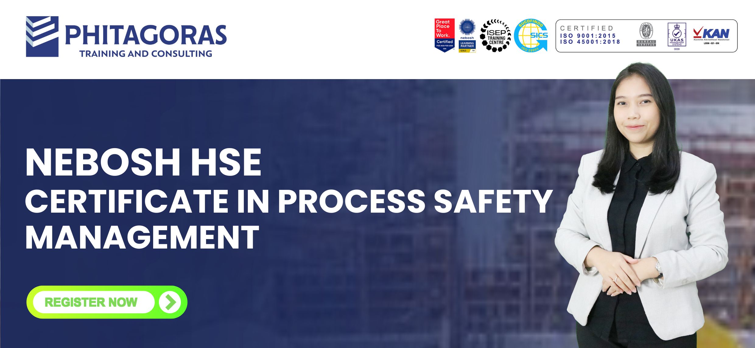 Established in 2003, Phitagoras is the official PJK3 of the Ministry of Manpower with No. KEP. P. 052 / BINWASK3-PNK3 / XI / 2017 and has 5 international accreditation/certification: ISO 9001: 2015 and ISO 45001:2018 (Bureau Veritas), ISO 29993:2017 (Sucofindo), Accredited Learning Partner NEBOSH UK, Registered Training Centre ISEP, Registered Centre CIEH UK and British Safety Council Approved Centre.